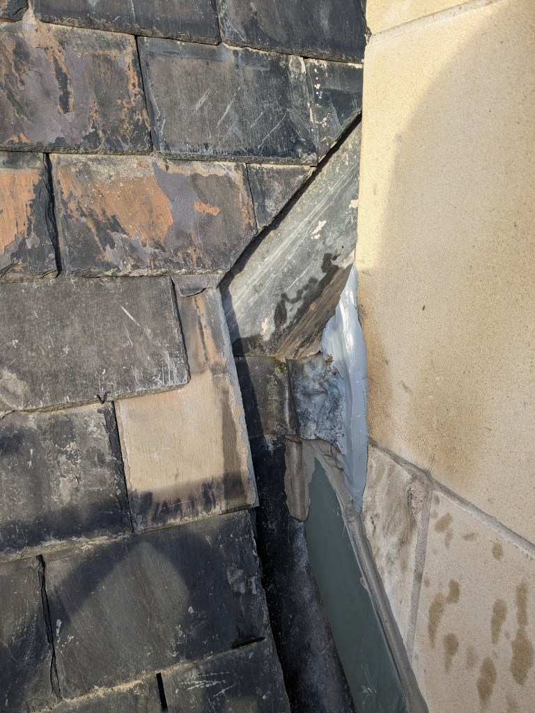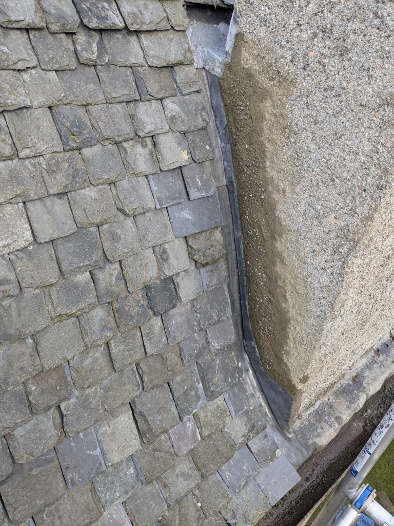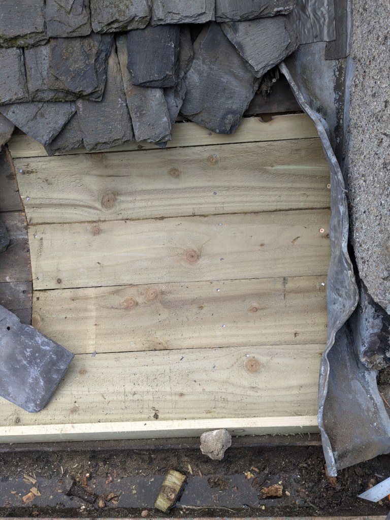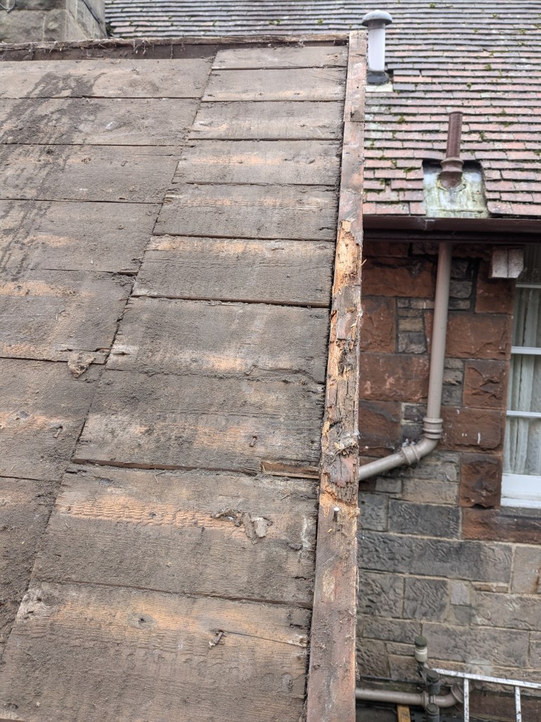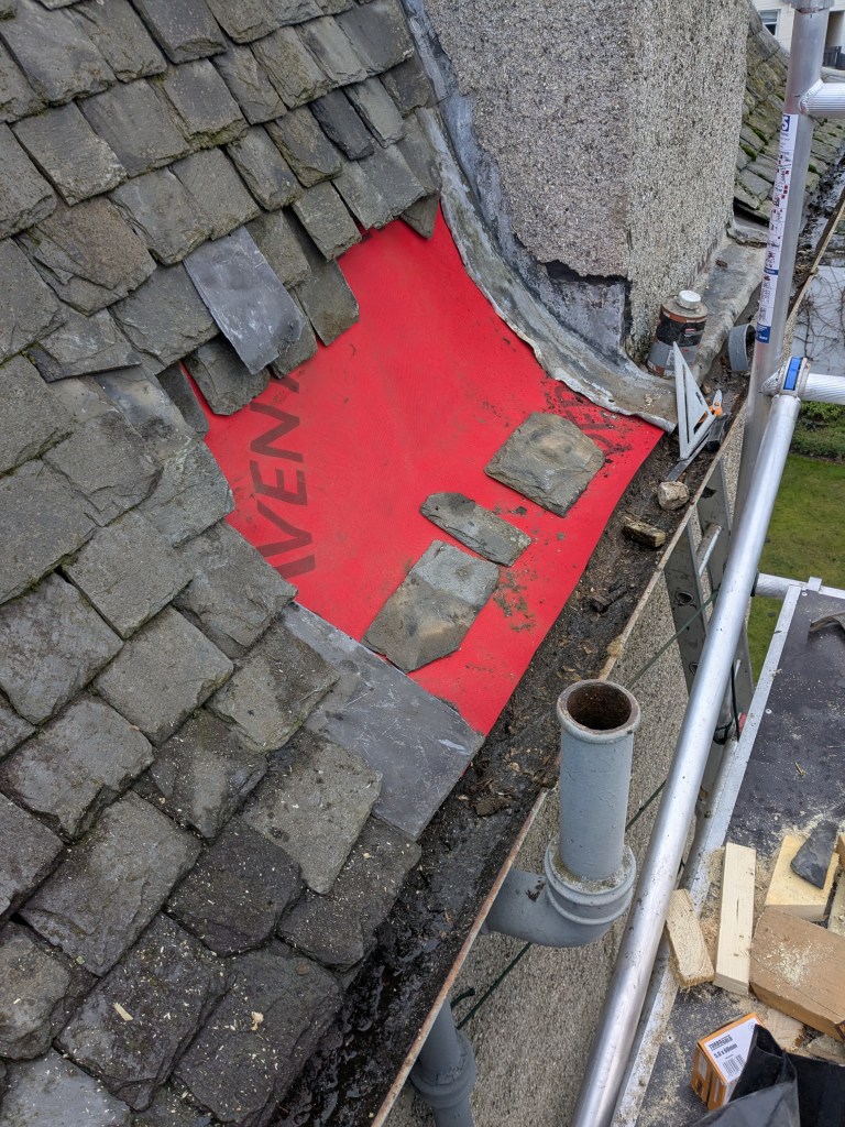 Dry rot identified. Stripped out, all rot removed. Wood treated. New membrane. Re-slate using as much original slate as possible.