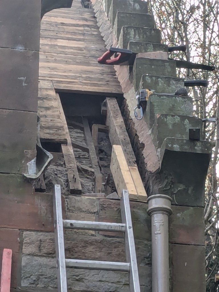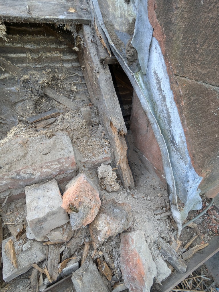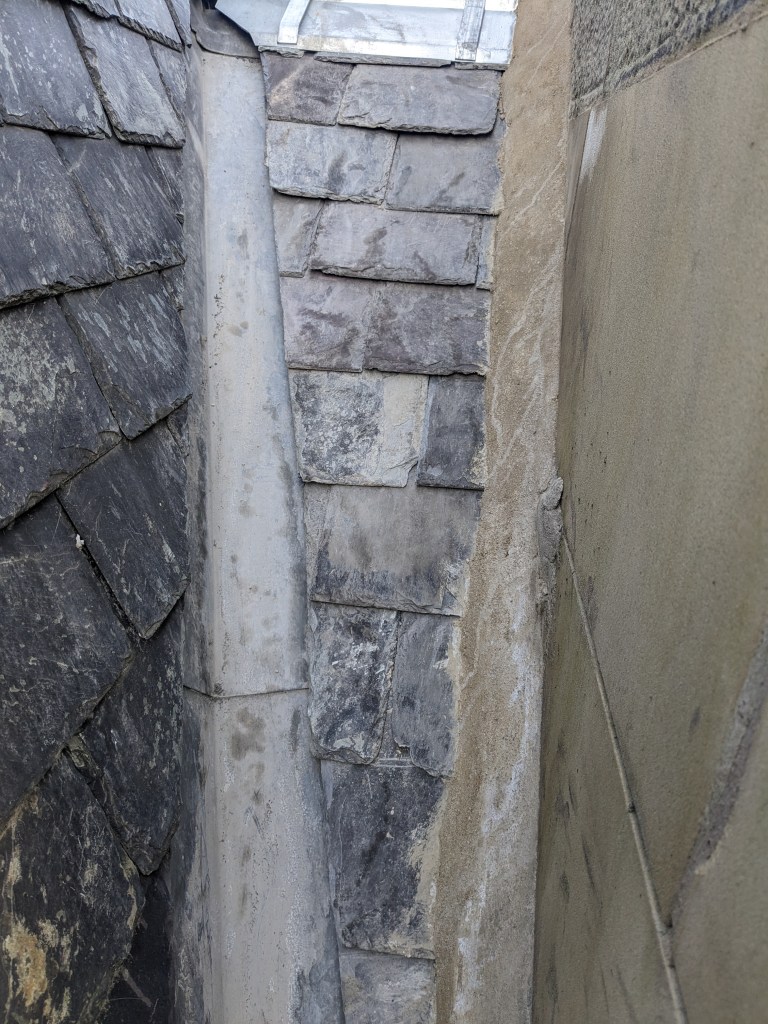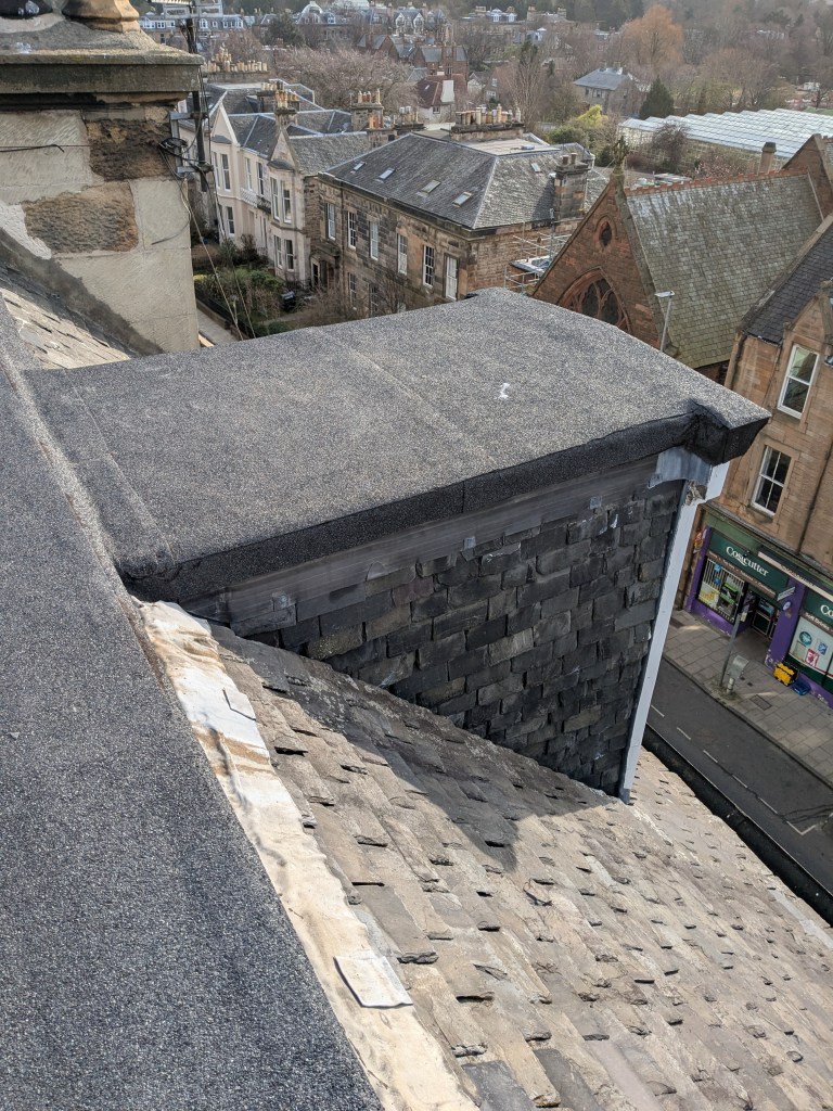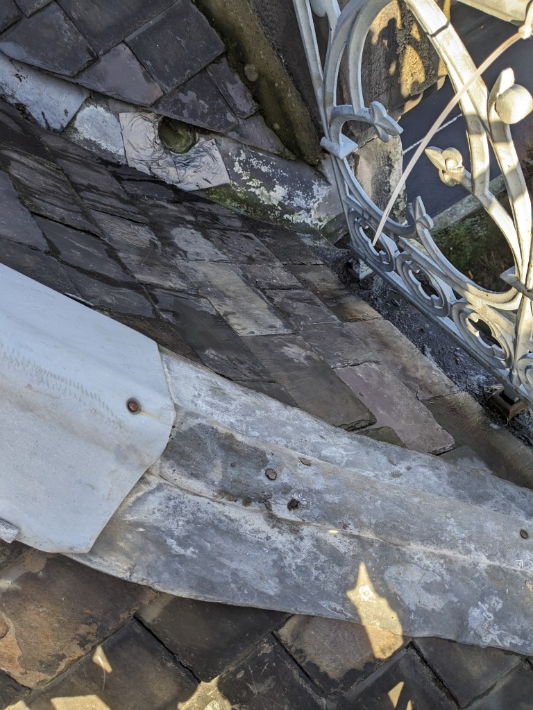 Dry rot identified. Stripped out, all rot removed. Wood treated. New membrane. Re-slate using as much original slate as possible.